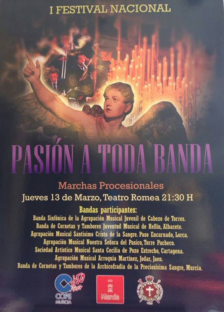 El próximo jueves 13 de marzo de 2014, a partir de las 21:30 horas, se celebrará en el Teatro Romea de Murcia la primera edición del Festival Nacional de Marchas Procesionales.